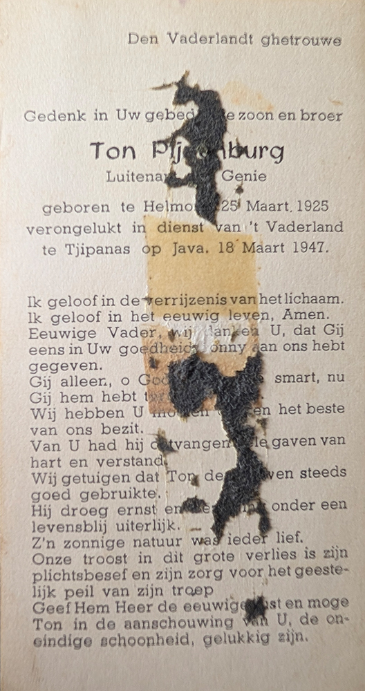 Op 18 maart 1947 komt Ton om het leven bij een ernstig verkeersongeval op de weg tussen Tjipanas en Tjiandjoer, in de binnenlanden ten zuidoosten van Buitenzorg. Hij is 21 jaar geworden en vindt zijn laatste rustplaats op het Nederlands ereveld Menteng Pulo in Jakarta.
